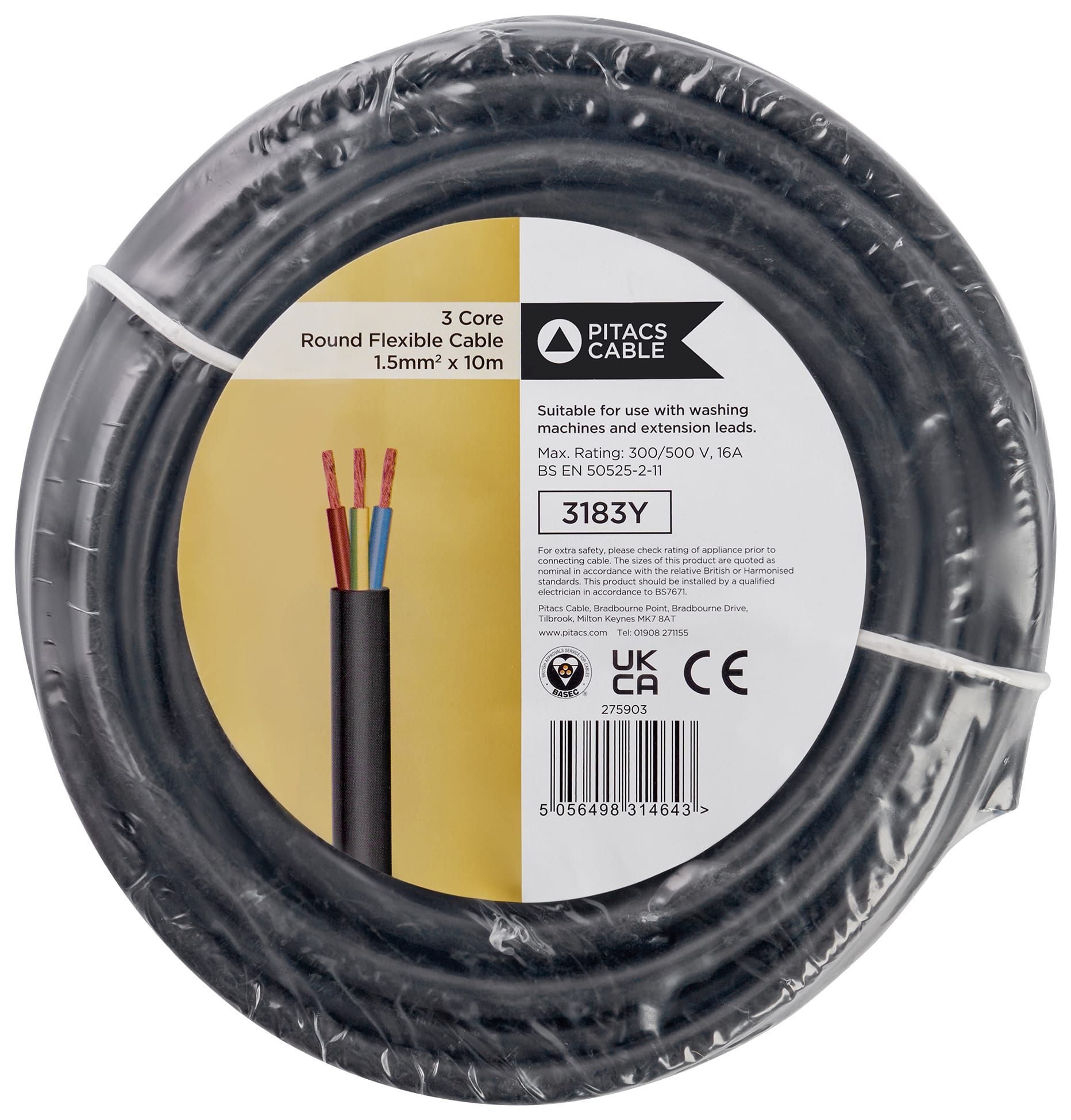 3 Core 3183Y Black Round Flexible Cable 1.5mm² 10m Wickes.co.uk